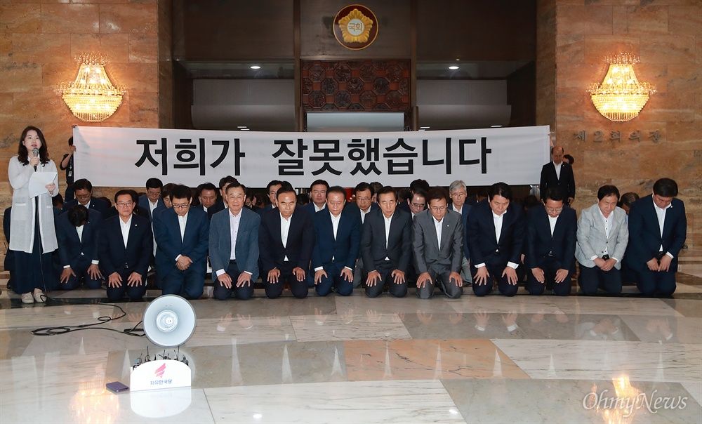 議員総会終了後、自由韓国党の議員たちは国会本会議場入り口のホールでひざまずき、「国民からいただいた最後のチャンスだと思い、初心に返る」と国民に対する謝罪文を発表した。そして、「私たちが間違っていました」という大きな横断幕の下で頭を下げた。