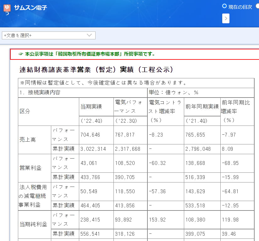2023年01月31日、韓国『サムスン電子』の2022年第4四半期の業績が公示されました。以下です。