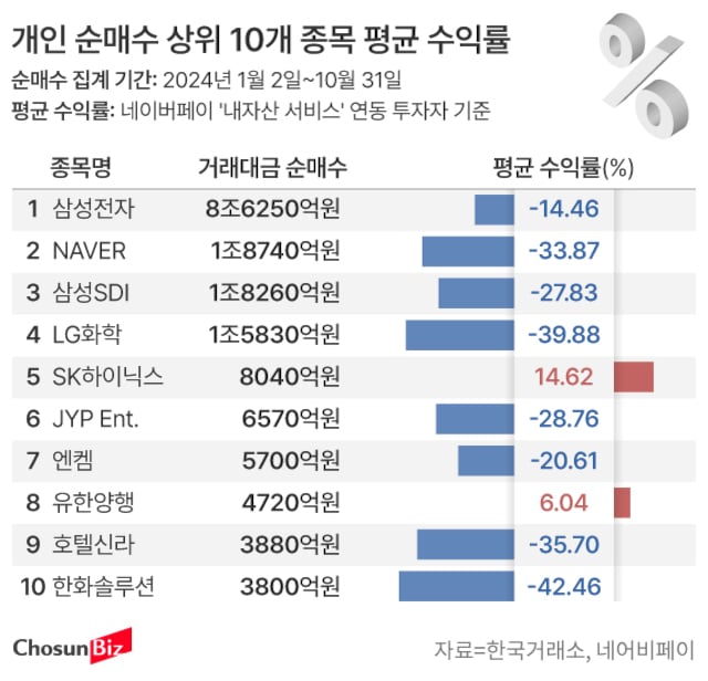 今年、個人が最も純購入した株はSamsung Electronicsです。今年に入ってから、10月末までに8兆6250億ウォンの買い優位がある。Naver Payの内部資産サービスにリンクされた248,158人のSamsung Electronics投資家の平均購入価格は69,205ウォンです。先月31日の終値59,200ウォンに基づくと、Samsung Electronicsは平均14.46%の損失を出しています。