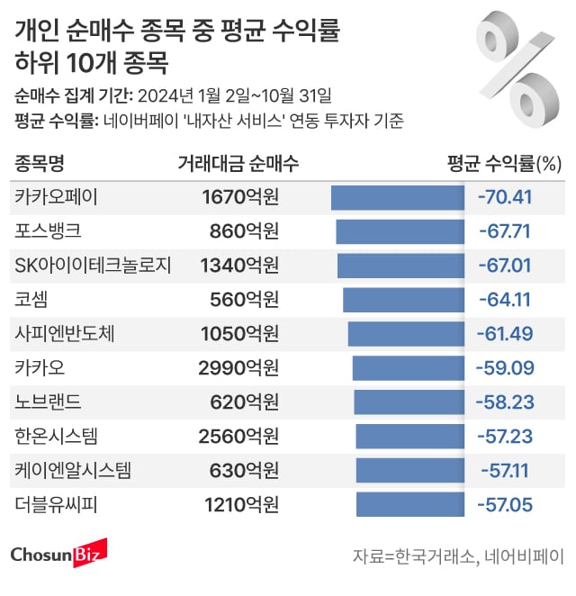 朝鮮ビズは2日、個人純買いが多かったKOSPI市場とKOSDAQ市場の100銘柄の株価と、今年10月末までにネイバーペイの「My Asset Service」に連動する投資家の平均購入価格を比較したところ、平均損失率は31.23%だった。この損失は、6月下旬の同時期の平均損失22.57%よりも深刻でした。